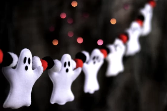 Add some spooky charm to your house with this ghostly Halloween garland by Greta In Wonderland. It features soft stuffed ghosts and pompoms.